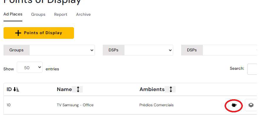 - Na listagem de adPlaces, clique no ícone DSPs.