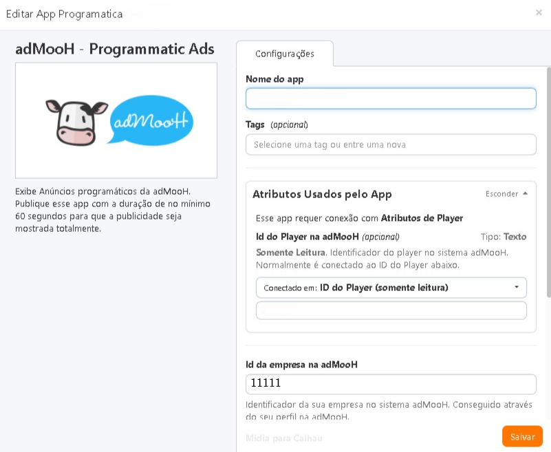 - ID do Player na adMooH: Deixe este campo vazio. Ao manter vazio, o sistema busca automaticamente o ID de cada dispositivo onde o app for tocado. Se você preencher este campo, o sistema ignorará a variável e usará um valor fixo para todas as telas, impedindo a identificação individual de